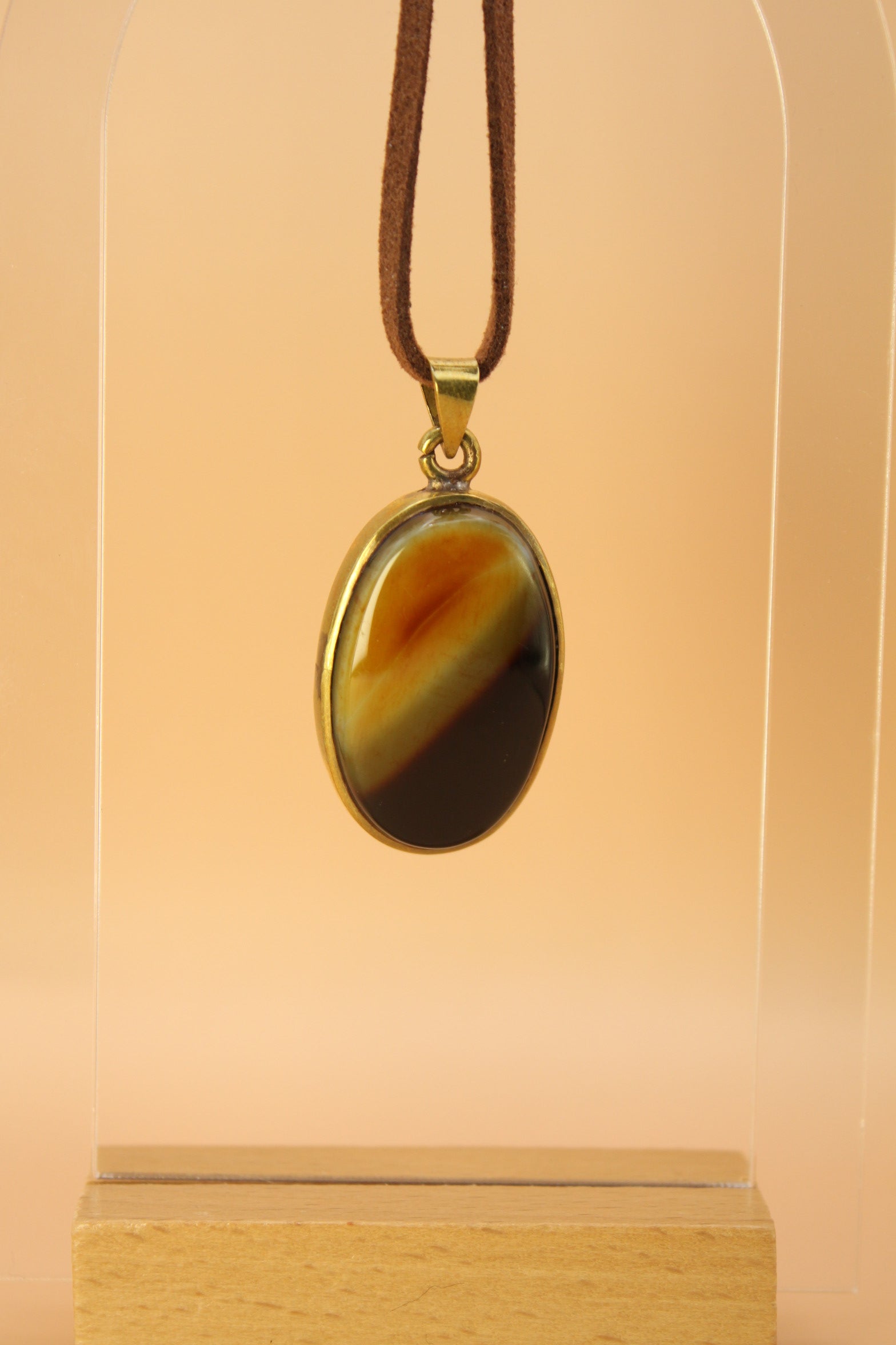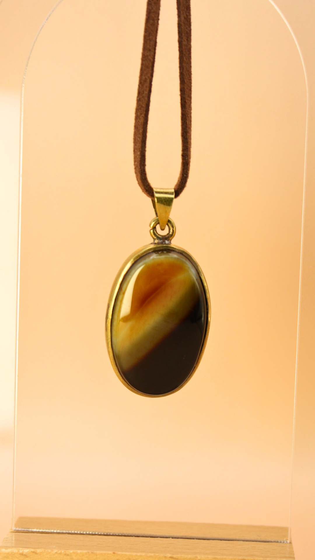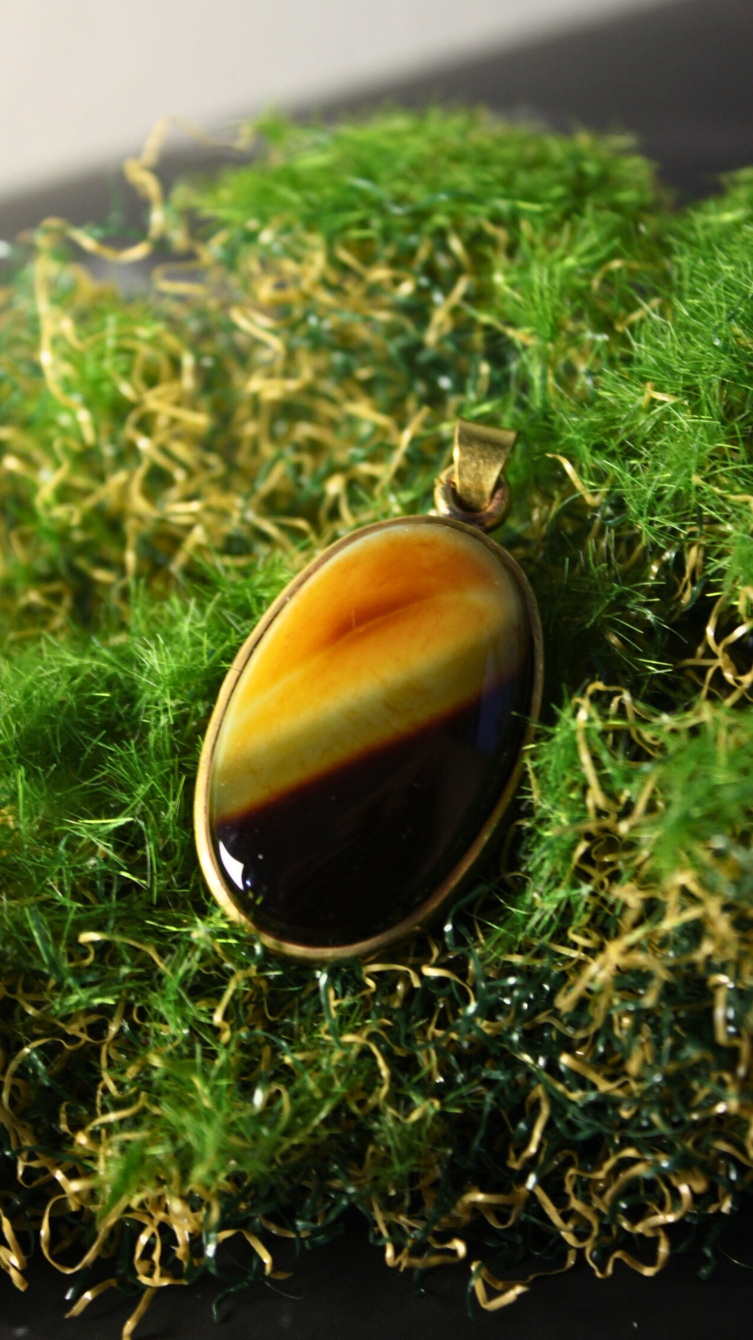 太陽の光を浴びたような暖かい色合いと、自然が生み出す個性的な模様が特徴のアゲートペンダントトップ。見る角度によって異なる表情を見せるそのデザインは、一点物ならではの魅力を持っています。