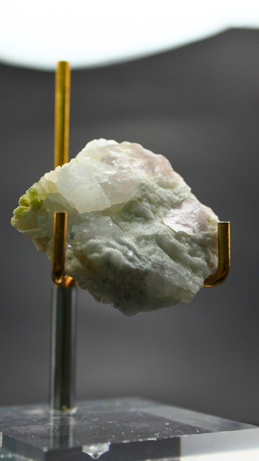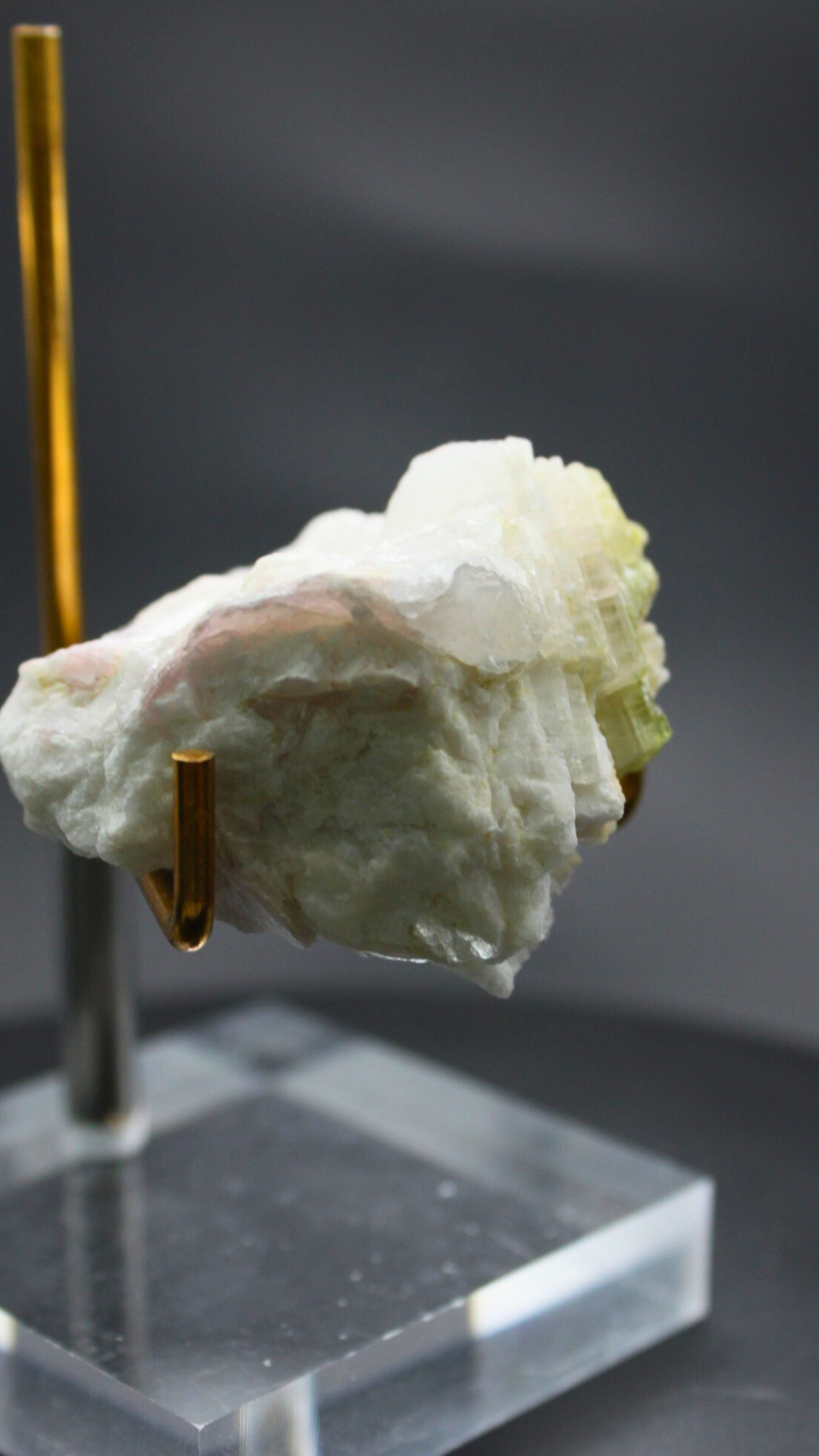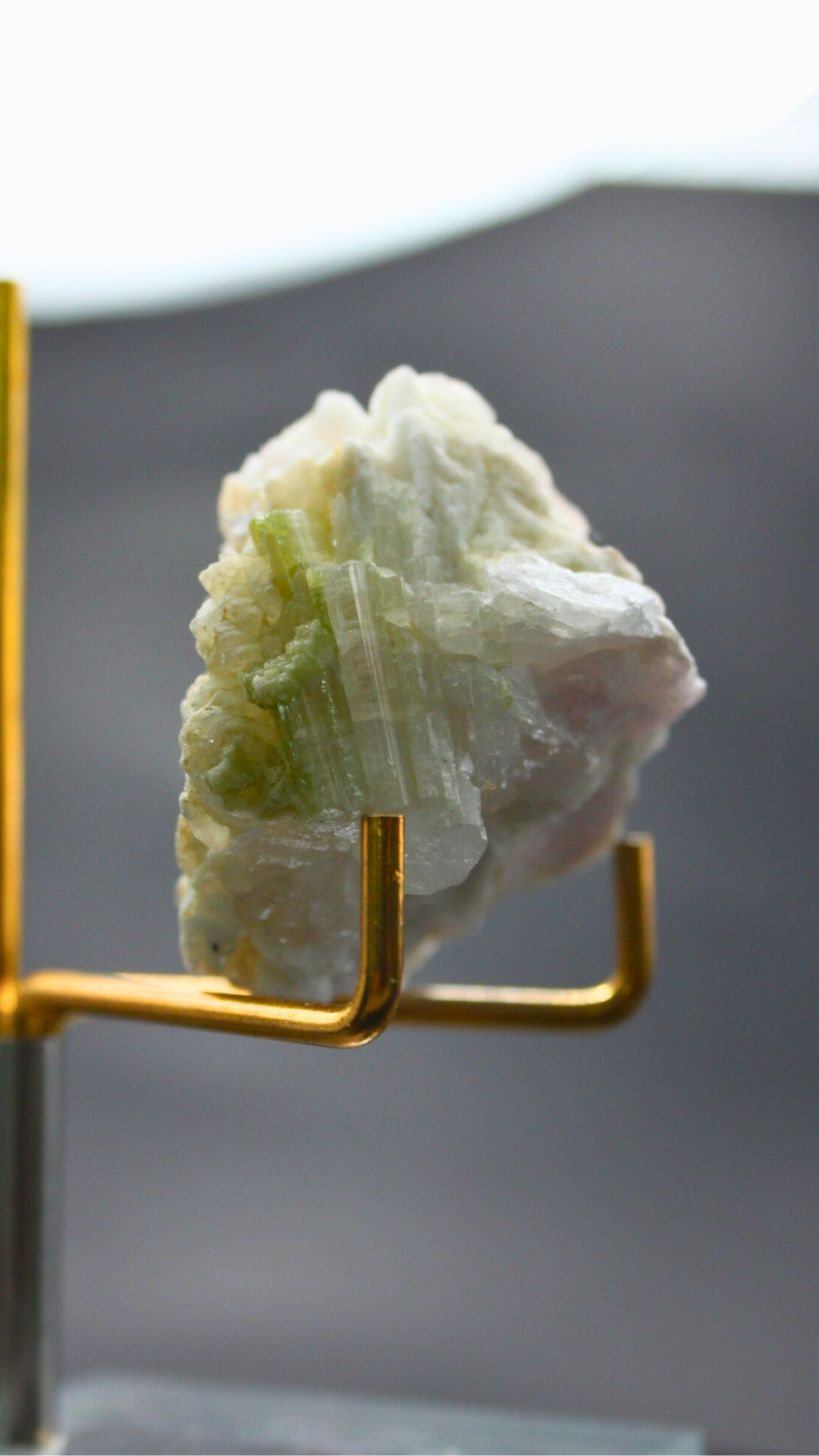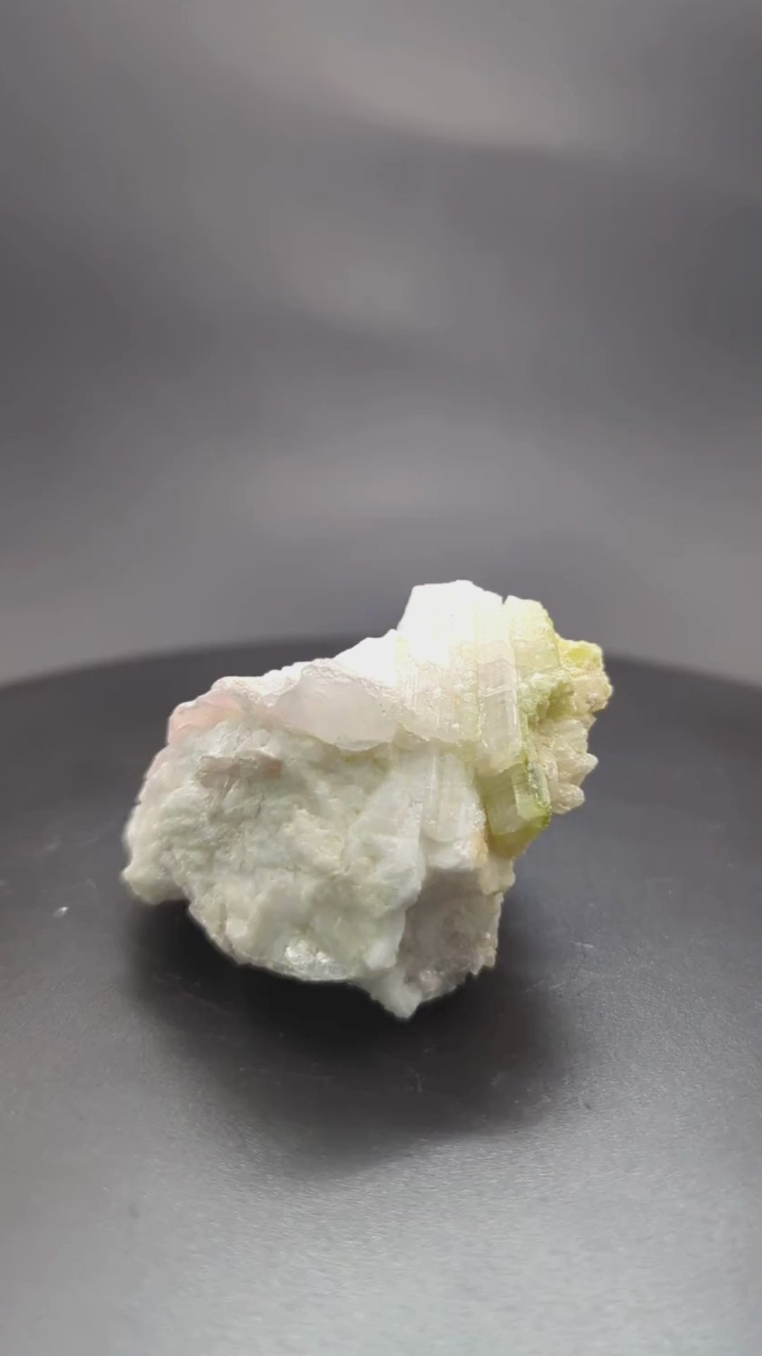 フンザ・ウルタル鉱山で採掘された、この美しいミネラル標本は、クリーミーな白いカルサイトの中に形成された淡いグリーンのトルマリンの結晶を特徴としています。トルマリンの繊細な緑色の結晶がカルサイトの柔らかなマトリックスと見事に調和し、自然が生み出すアートのような魅力を持っています。このクラスターは、インテリアに自然のエレガンスを加えるだけでなく、鉱物コレクションにも最適な一品です。